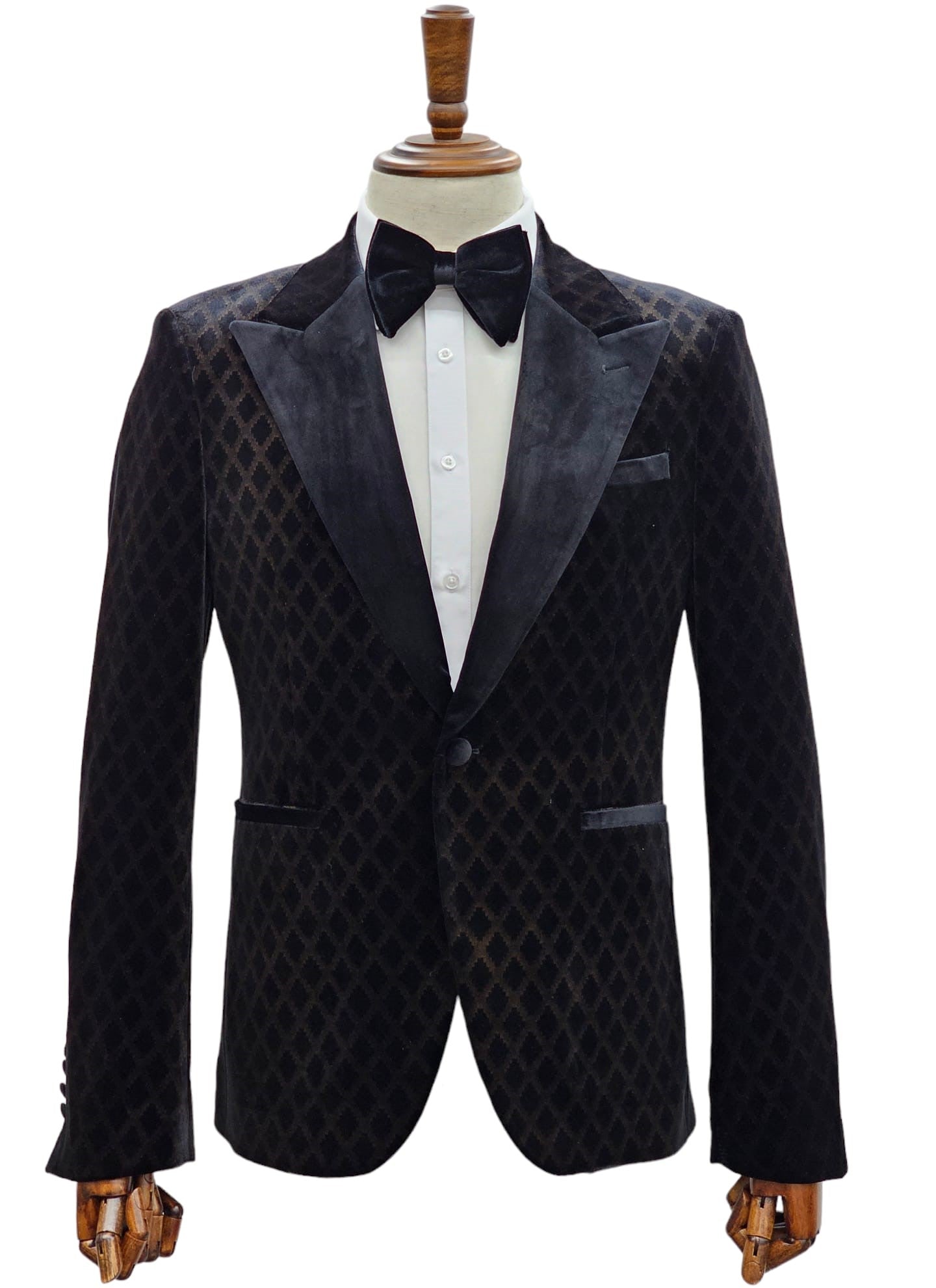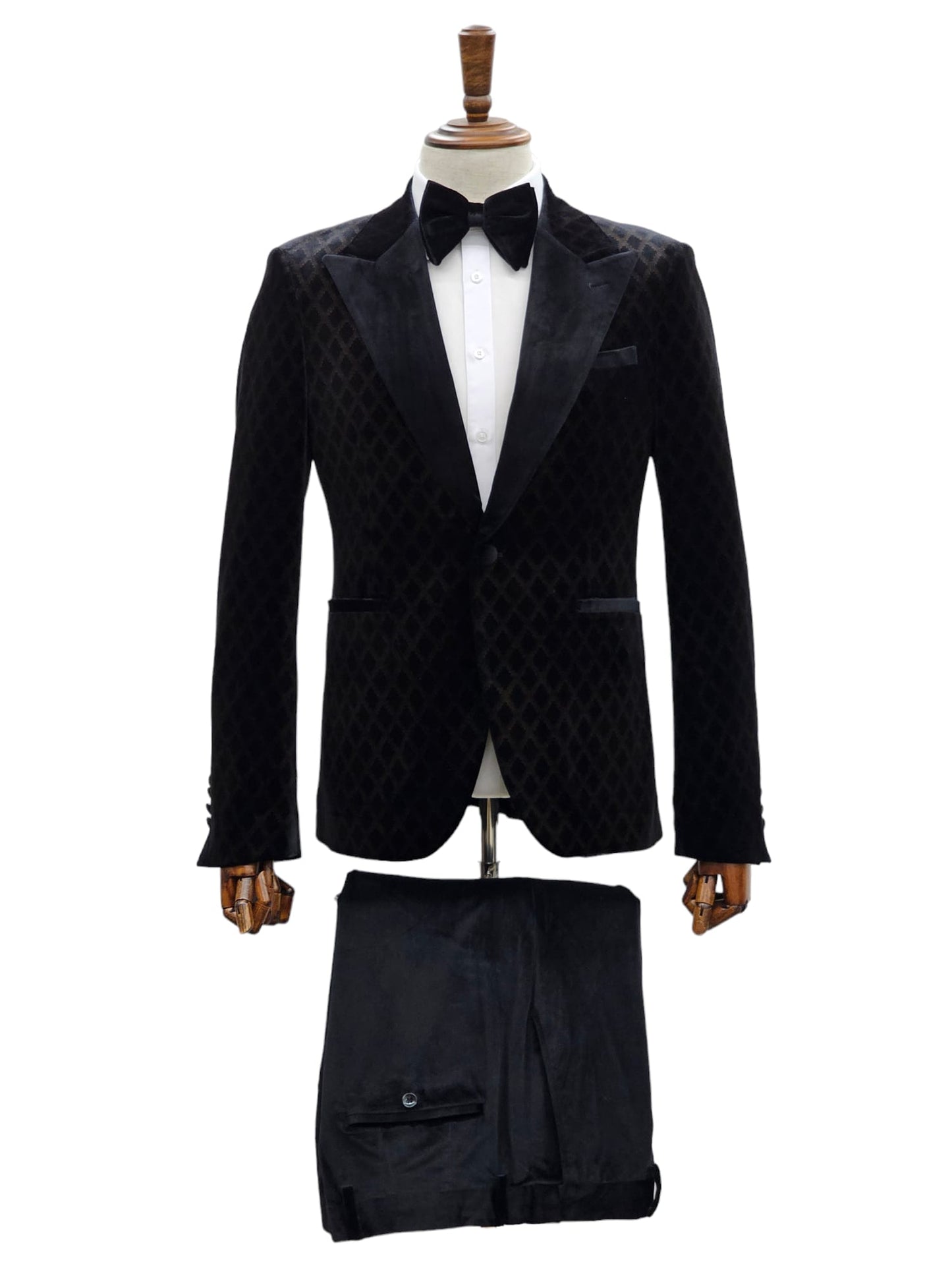 EFFETTI BY Giovanni Testi 2 Piece Slim Fit Velvet Suit, Diamond pattern, Black Satin Peak Lapel, 1 Button, Center Vent, Black Satin Pants.