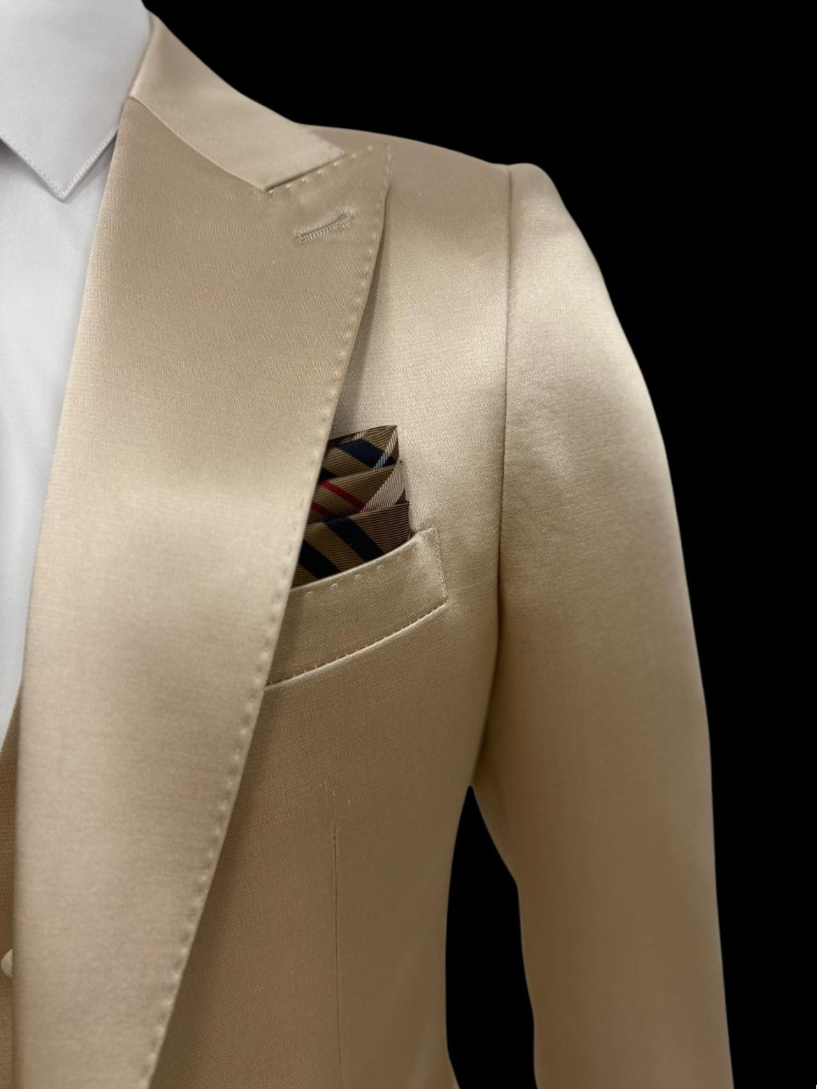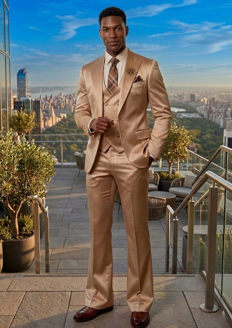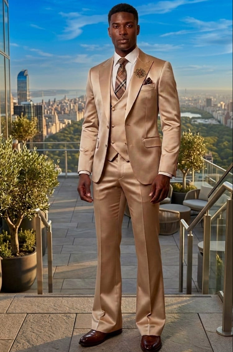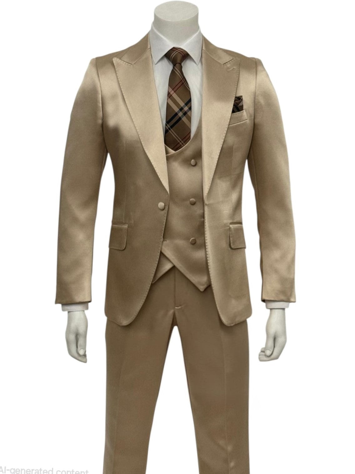 GIOVANNI TESTI SLIM FIT Satin 3 Piece Suit, 1 Button, Peak Lapel, Double Breasted Vest, Center Vent, Shiny Fabric, Matching pants with flair hem.