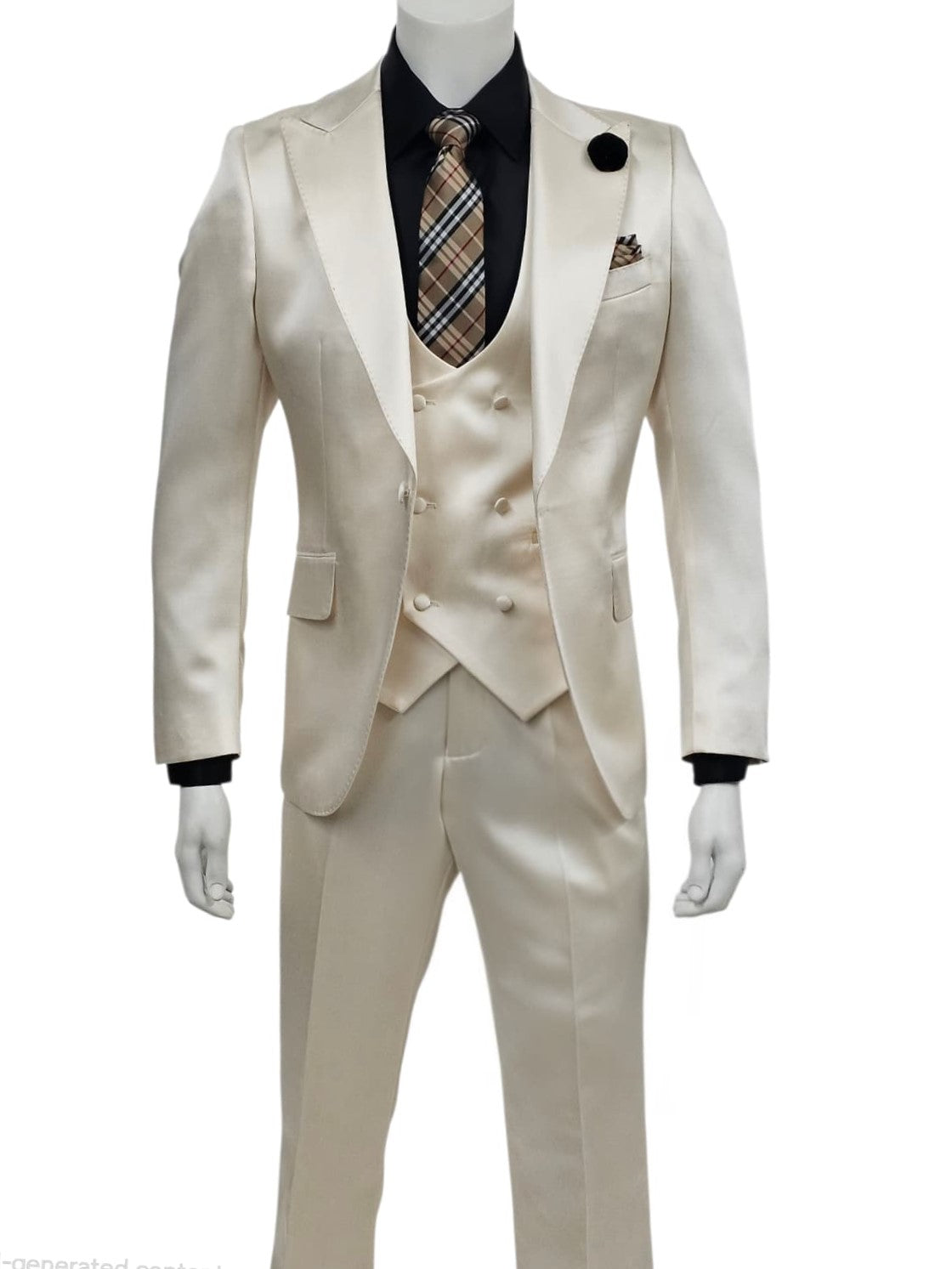 GIOVANNI TESTI SLIM FIT Satin 3 Piece Suit, 1 Button, Peak Lapel, Double Breasted Vest, Center Vent, Shiny Fabric, Matching pants with flair hem.