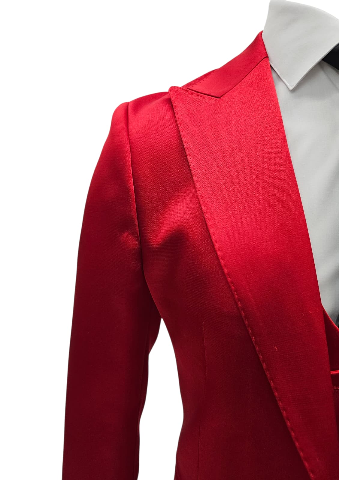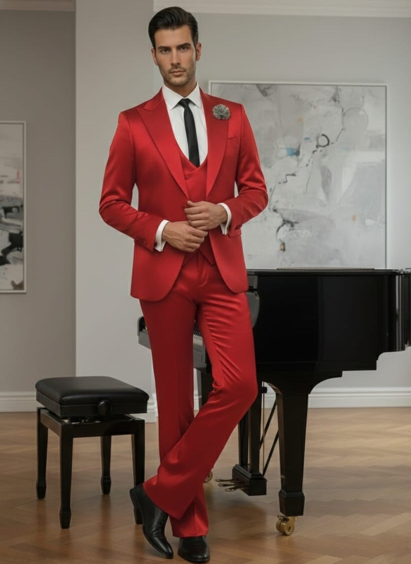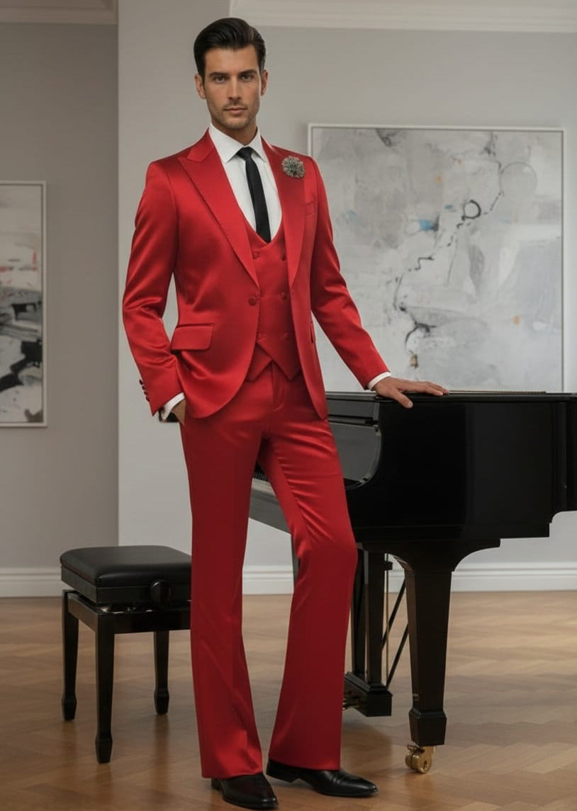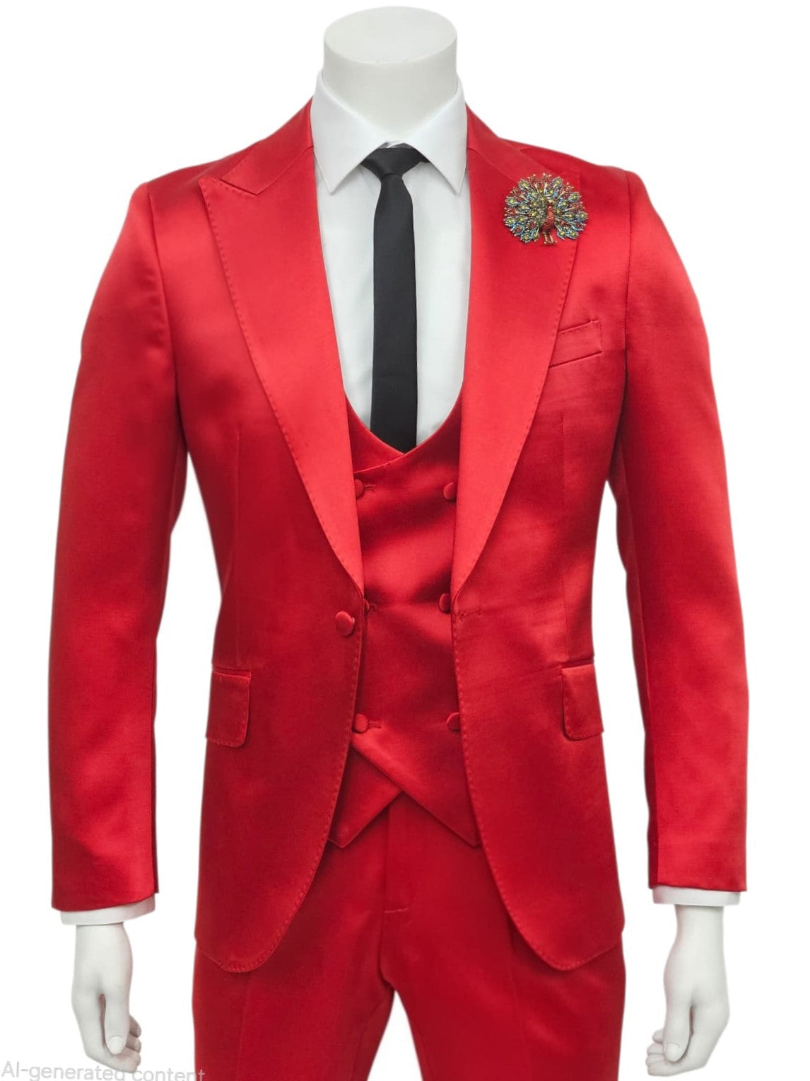 GIOVANNI TESTI SLIM FIT Satin 3 Piece Suit, 1 Button, Peak Lapel, Double Breasted Vest, Center Vent, Shiny Fabric, Matching pants with flair hem.