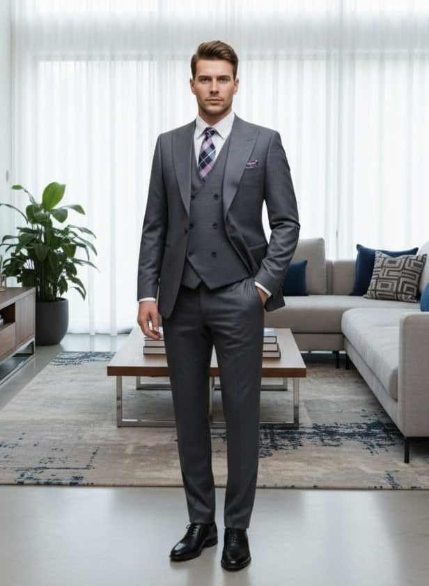 GIOVANNI TESTI SLIM FIT Suit with Stretch Fabric, Peak Lapel, 1 Button, Double Breast Vest, Center Vent.