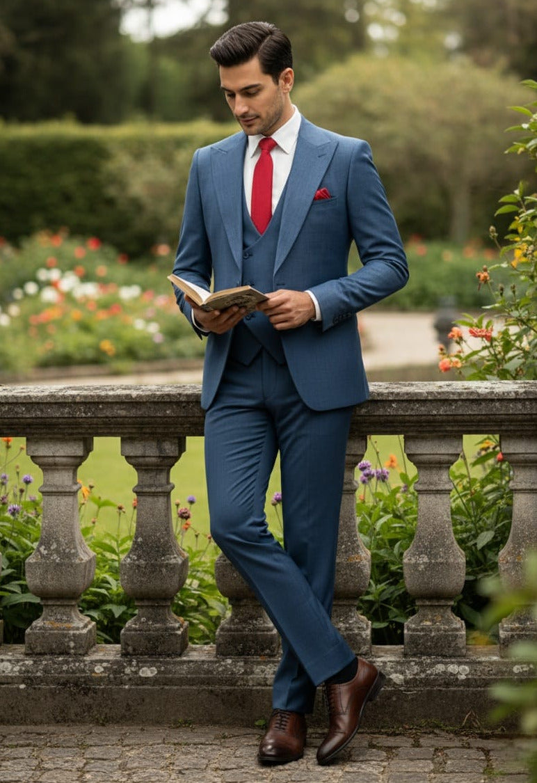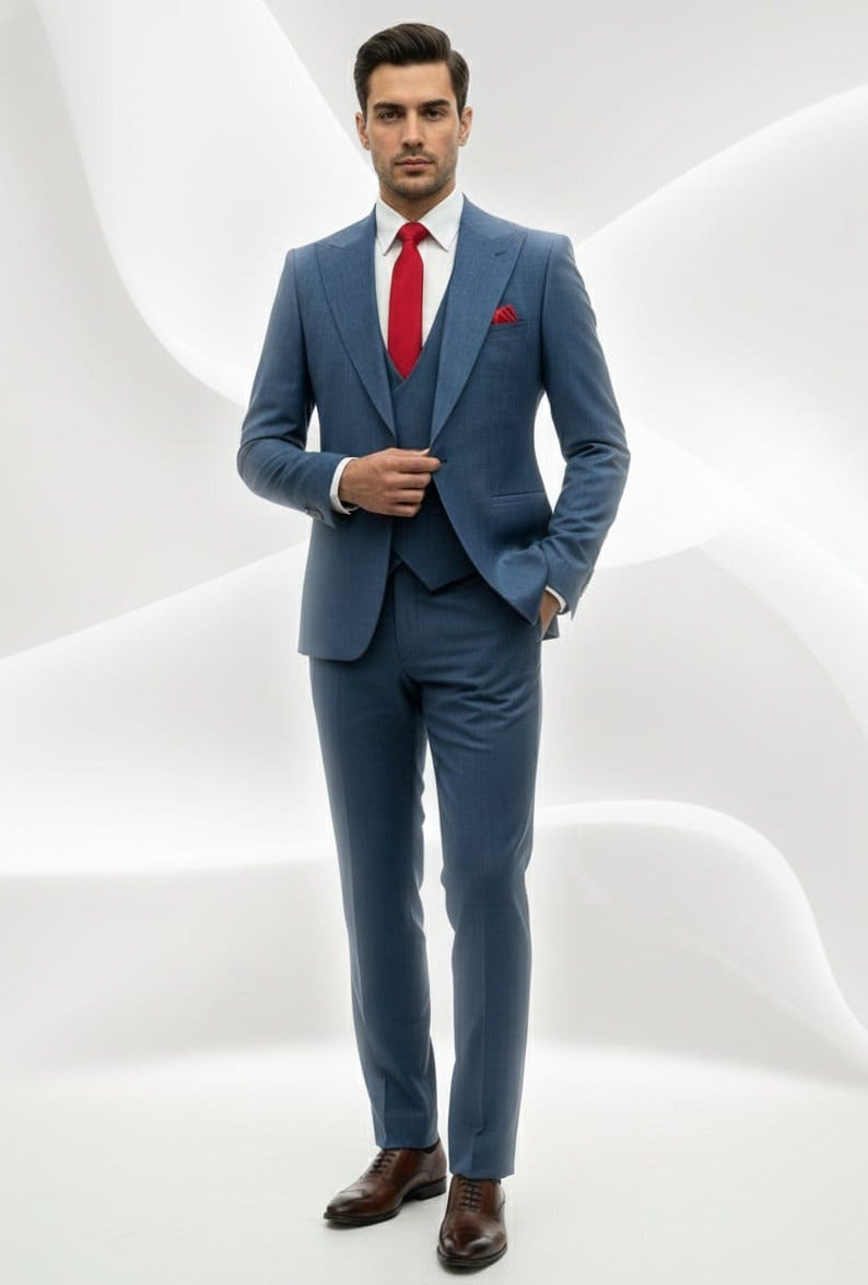 GIOVANNI TESTI SLIM FIT Suit with Stretch Fabric, Peak Lapel, 1 Button, Double Breast Vest, Center Vent.